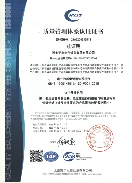 品质办理系统认证证书-西安亚欧电气装备团体无限公司 | 西安高压成套开关柜 | 西安高压成套开关柜 | 西安箱式变电站 | 陕科配件 | 汇创达变频器 | 陕西变频器一体机 | 陕西变频器维修